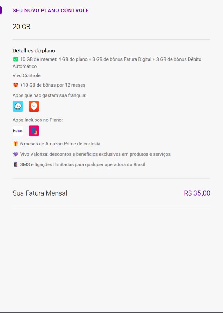 Se você se interessou por esta oferta e deseja aproveitar o novo plano Vivo Controle com 20 GB por apenas R$ 35, não perca tempo! Esta é uma promoção por tempo limitado e pode encerrar a qualquer momento.