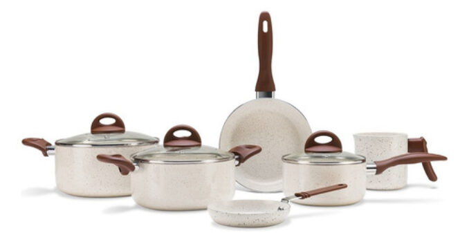 | Material | Alumínio com revestimento cerâmico; Cabos e alças: Baquelite; Tampas: Vidro temperado; Conjunto: 6 peças; Cor: Bege com detalhes marrons; Fundo: Indução; Design: Moderno e elegante; Resistência: Alta durabilidade; Limpeza: Fácil de limpar; Compatibilidade: Fogões a gás, elétricos e de indução. |