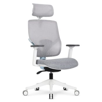 A cadeira oferece ergonomia com ajuste de altura manual, apoio de cabeça 2D e braços 2D, proporcionando conforto e suporte adequados para longas horas de uso. O material em mesh no encosto favorece a ventilação, enquanto o tecido Ultrasoft no assento oferece um toque suave.