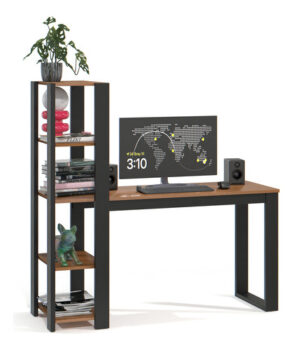 - A mesa possui uma prateleira que oferece espaço para organização.