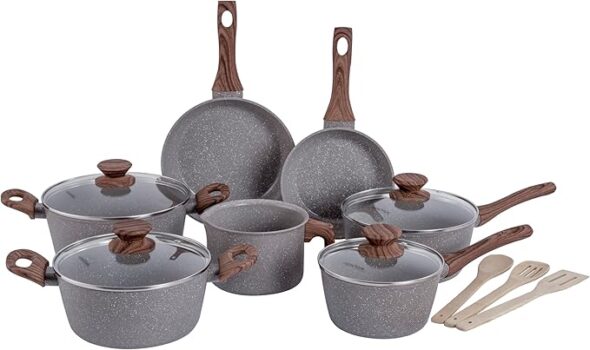 | Conjunto de 10 peças (inclui panelas, caçarolas, frigideiras e utensílios de madeira) |